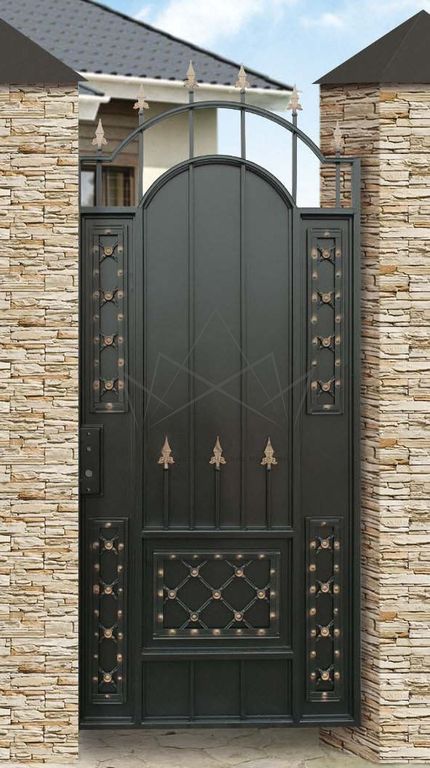 Кованые калитки привносят свою особенную нотку в общий вид участка. Их могут украшать цветы или металлические завитки, острые шпили, затейливые абстрактные или флористические узоры, плавные линии и острые углы, прутья разной толщины и формы. Вид узора кованых заборов, цвет металла и сочетание его с другими строительными материалами позволяет воплотить в реальность любые дизайнерские задумки.
