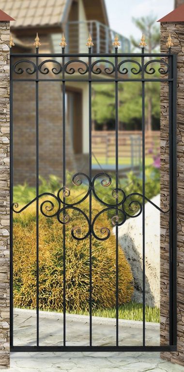 Кованые калитки привносят свою особенную нотку в общий вид участка. Их могут украшать цветы или металлические завитки, острые шпили, затейливые абстрактные или флористические узоры, плавные линии и острые углы, прутья разной толщины и формы. Вид узора кованых заборов, цвет металла и сочетание его с другими строительными материалами позволяет воплотить в реальность любые дизайнерские задумки.