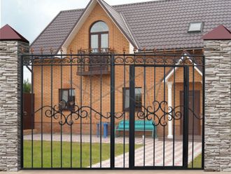 Кованые ворота привносят свою особенную нотку в общий вид участка. Их могут украшать цветы или металлические завитки, острые шпили, затейливые абстрактные или флористические узоры, плавные линии и острые углы, прутья разной толщины и формы. Вид узора кованых заборов, цвет металла и сочетание его с другими строительными материалами позволяет воплотить в реальность любые дизайнерские задумки.