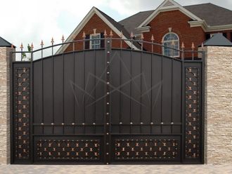 Кованые ворота привносят свою особенную нотку в общий вид участка. Их могут украшать цветы или металлические завитки, острые шпили, затейливые абстрактные или флористические узоры, плавные линии и острые углы, прутья разной толщины и формы. Вид узора кованых заборов, цвет металла и сочетание его с другими строительными материалами позволяет воплотить в реальность любые дизайнерские задумки.