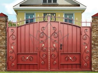 Кованые ворота привносят свою особенную нотку в общий вид участка. Их могут украшать цветы или металлические завитки, острые шпили, затейливые абстрактные или флористические узоры, плавные линии и острые углы, прутья разной толщины и формы. Вид узора кованых заборов, цвет металла и сочетание его с другими строительными материалами позволяет воплотить в реальность любые дизайнерские задумки.