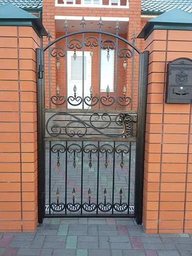 Кованые калитки привносят свою особенную нотку в общий вид участка. Их могут украшать цветы или металлические завитки, острые шпили, затейливые абстрактные или флористические узоры, плавные линии и острые углы, прутья разной толщины и формы. Вид узора кованых заборов, цвет металла и сочетание его с другими строительными материалами позволяет воплотить в реальность любые дизайнерские задумки.