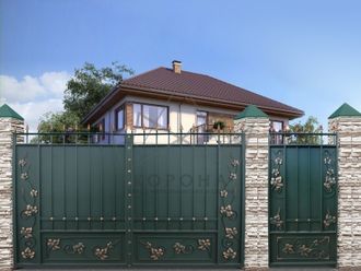 Кованые ворота привносят свою особенную нотку в общий вид участка. Их могут украшать цветы или металлические завитки, острые шпили, затейливые абстрактные или флористические узоры, плавные линии и острые углы, прутья разной толщины и формы. Вид узора кованых заборов, цвет металла и сочетание его с другими строительными материалами позволяет воплотить в реальность любые дизайнерские задумки.