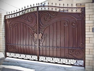 Кованые ворота привносят свою особенную нотку в общий вид участка. Их могут украшать цветы или металлические завитки, острые шпили, затейливые абстрактные или флористические узоры, плавные линии и острые углы, прутья разной толщины и формы. Вид узора кованых заборов, цвет металла и сочетание его с другими строительными материалами позволяет воплотить в реальность любые дизайнерские задумки.