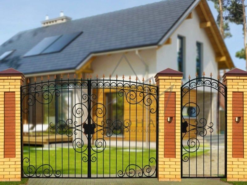 Кованые ворота привносят свою особенную нотку в общий вид участка. Их могут украшать цветы или металлические завитки, острые шпили, затейливые абстрактные или флористические узоры, плавные линии и острые углы, прутья разной толщины и формы. Вид узора кованых заборов, цвет металла и сочетание его с другими строительными материалами позволяет воплотить в реальность любые дизайнерские задумки.