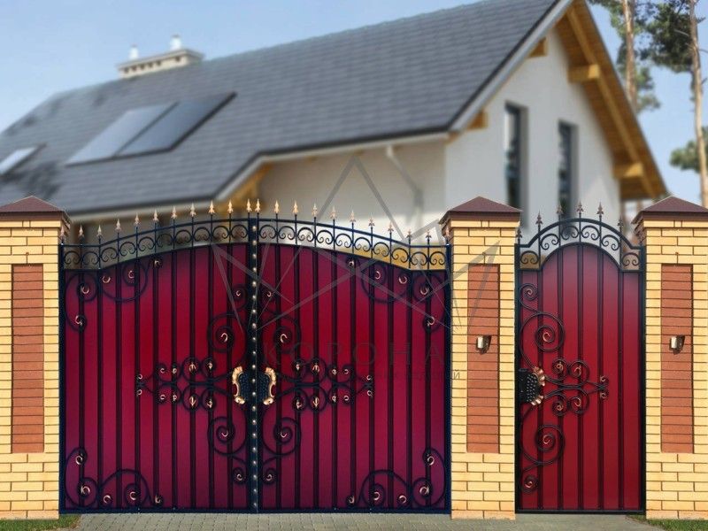 Кованые ворота привносят свою особенную нотку в общий вид участка. Их могут украшать цветы или металлические завитки, острые шпили, затейливые абстрактные или флористические узоры, плавные линии и острые углы, прутья разной толщины и формы. Вид узора кованых заборов, цвет металла и сочетание его с другими строительными материалами позволяет воплотить в реальность любые дизайнерские задумки.