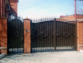 Кованые ворота привносят свою особенную нотку в общий вид участка. Их могут украшать цветы или металлические завитки, острые шпили, затейливые абстрактные или флористические узоры, плавные линии и острые углы, прутья разной толщины и формы. Вид узора кованых заборов, цвет металла и сочетание его с другими строительными материалами позволяет воплотить в реальность любые дизайнерские задумки.