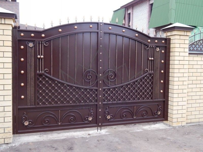 Кованые ворота привносят свою особенную нотку в общий вид участка. Их могут украшать цветы или металлические завитки, острые шпили, затейливые абстрактные или флористические узоры, плавные линии и острые углы, прутья разной толщины и формы. Вид узора кованых заборов, цвет металла и сочетание его с другими строительными материалами позволяет воплотить в реальность любые дизайнерские задумки.