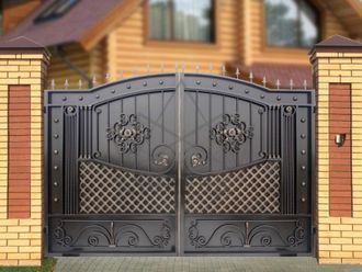 Кованые ворота привносят свою особенную нотку в общий вид участка. Их могут украшать цветы или металлические завитки, острые шпили, затейливые абстрактные или флористические узоры, плавные линии и острые углы, прутья разной толщины и формы. Вид узора кованых заборов, цвет металла и сочетание его с другими строительными материалами позволяет воплотить в реальность любые дизайнерские задумки.
