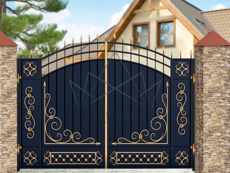 Кованые ворота привносят свою особенную нотку в общий вид участка. Их могут украшать цветы или металлические завитки, острые шпили, затейливые абстрактные или флористические узоры, плавные линии и острые углы, прутья разной толщины и формы. Вид узора кованых заборов, цвет металла и сочетание его с другими строительными материалами позволяет воплотить в реальность любые дизайнерские задумки.