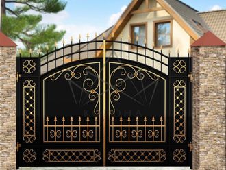 Кованые ворота привносят свою особенную нотку в общий вид участка. Их могут украшать цветы или металлические завитки, острые шпили, затейливые абстрактные или флористические узоры, плавные линии и острые углы, прутья разной толщины и формы. Вид узора кованых заборов, цвет металла и сочетание его с другими строительными материалами позволяет воплотить в реальность любые дизайнерские задумки.