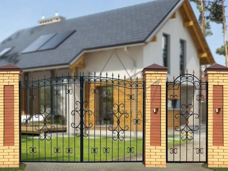 Кованые ворота привносят свою особенную нотку в общий вид участка. Их могут украшать цветы или металлические завитки, острые шпили, затейливые абстрактные или флористические узоры, плавные линии и острые углы, прутья разной толщины и формы. Вид узора кованых заборов, цвет металла и сочетание его с другими строительными материалами позволяет воплотить в реальность любые дизайнерские задумки.