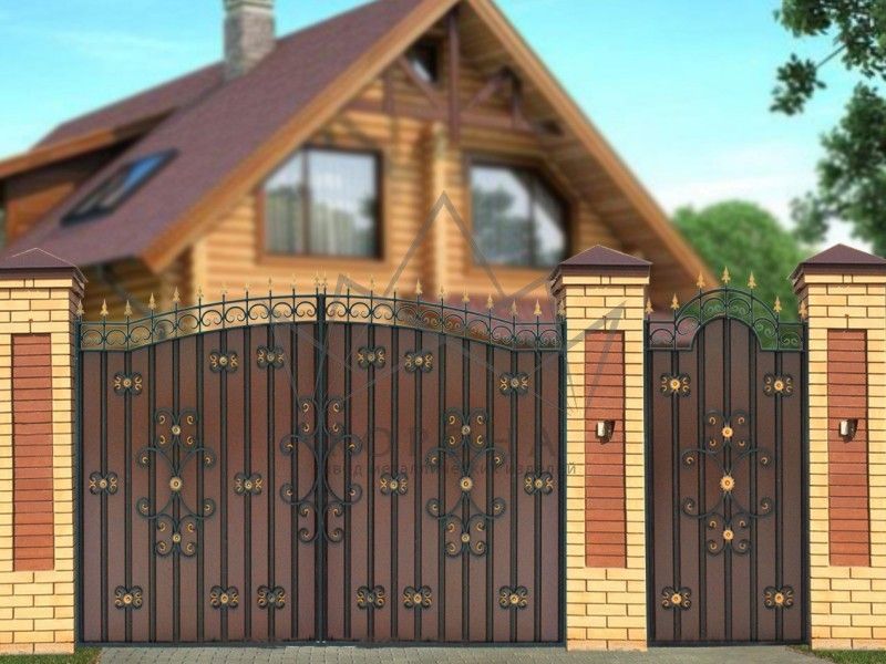 Кованые ворота привносят свою особенную нотку в общий вид участка. Их могут украшать цветы или металлические завитки, острые шпили, затейливые абстрактные или флористические узоры, плавные линии и острые углы, прутья разной толщины и формы. Вид узора кованых заборов, цвет металла и сочетание его с другими строительными материалами позволяет воплотить в реальность любые дизайнерские задумки.