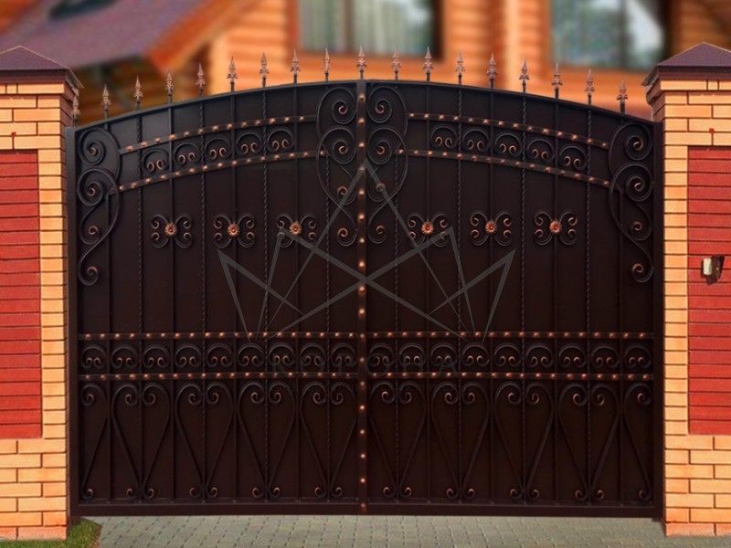 Кованые ворота привносят свою особенную нотку в общий вид участка. Их могут украшать цветы или металлические завитки, острые шпили, затейливые абстрактные или флористические узоры, плавные линии и острые углы, прутья разной толщины и формы. Вид узора кованых заборов, цвет металла и сочетание его с другими строительными материалами позволяет воплотить в реальность любые дизайнерские задумки.