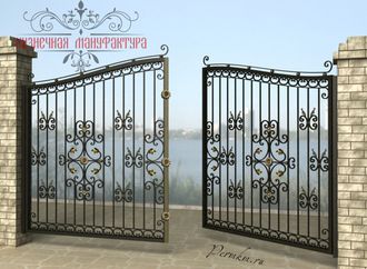 Кованые ворота привносят свою особенную нотку в общий вид участка. Их могут украшать цветы или металлические завитки, острые шпили, затейливые абстрактные или флористические узоры, плавные линии и острые углы, прутья разной толщины и формы. Вид узора кованых заборов, цвет металла и сочетание его с другими строительными материалами позволяет воплотить в реальность любые дизайнерские задумки.