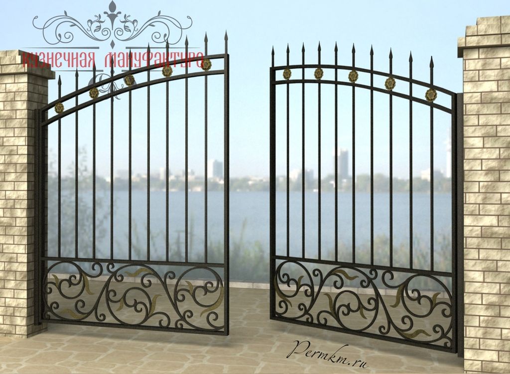 Кованые ворота привносят свою особенную нотку в общий вид участка. Их могут украшать цветы или металлические завитки, острые шпили, затейливые абстрактные или флористические узоры, плавные линии и острые углы, прутья разной толщины и формы. Вид узора кованых заборов, цвет металла и сочетание его с другими строительными материалами позволяет воплотить в реальность любые дизайнерские задумки.