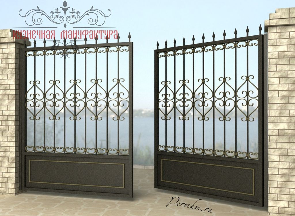 Кованые ворота привносят свою особенную нотку в общий вид участка. Их могут украшать цветы или металлические завитки, острые шпили, затейливые абстрактные или флористические узоры, плавные линии и острые углы, прутья разной толщины и формы. Вид узора кованых заборов, цвет металла и сочетание его с другими строительными материалами позволяет воплотить в реальность любые дизайнерские задумки.