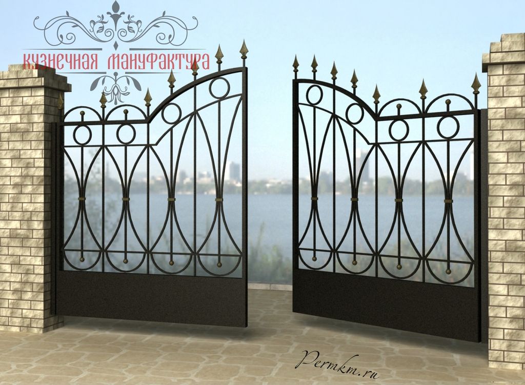 Кованые ворота привносят свою особенную нотку в общий вид участка. Их могут украшать цветы или металлические завитки, острые шпили, затейливые абстрактные или флористические узоры, плавные линии и острые углы, прутья разной толщины и формы. Вид узора кованых заборов, цвет металла и сочетание его с другими строительными материалами позволяет воплотить в реальность любые дизайнерские задумки.