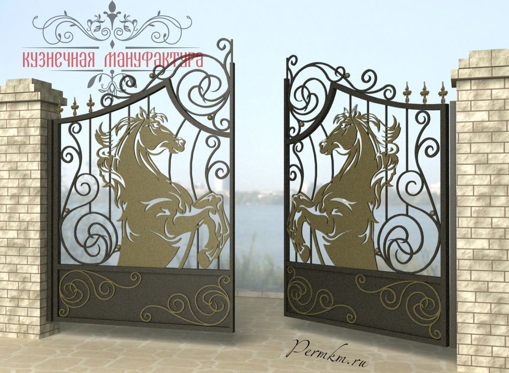 Кованые ворота привносят свою особенную нотку в общий вид участка. Их могут украшать цветы или металлические завитки, острые шпили, затейливые абстрактные или флористические узоры, плавные линии и острые углы, прутья разной толщины и формы. Вид узора кованых заборов, цвет металла и сочетание его с другими строительными материалами позволяет воплотить в реальность любые дизайнерские задумки.