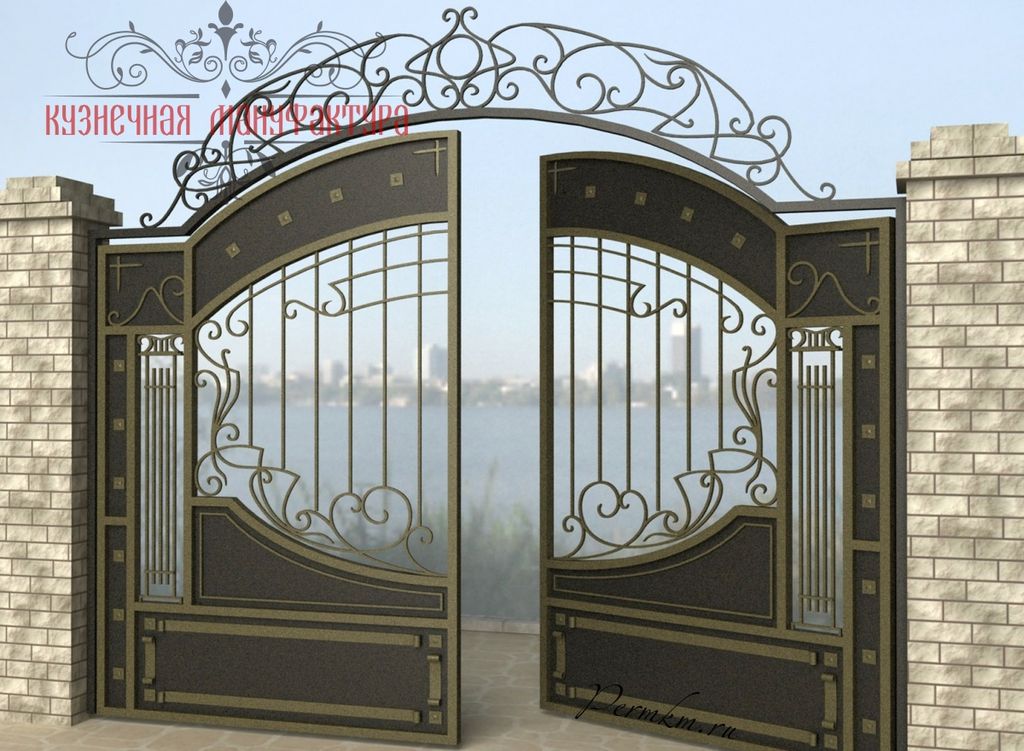 Кованые ворота привносят свою особенную нотку в общий вид участка. Их могут украшать цветы или металлические завитки, острые шпили, затейливые абстрактные или флористические узоры, плавные линии и острые углы, прутья разной толщины и формы. Вид узора кованых заборов, цвет металла и сочетание его с другими строительными материалами позволяет воплотить в реальность любые дизайнерские задумки.