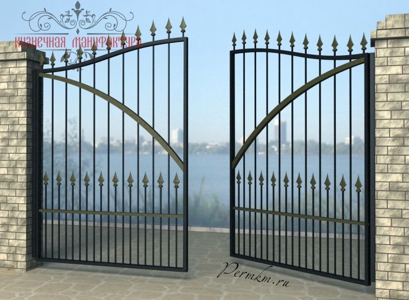 Кованые ворота привносят свою особенную нотку в общий вид участка. Их могут украшать цветы или металлические завитки, острые шпили, затейливые абстрактные или флористические узоры, плавные линии и острые углы, прутья разной толщины и формы. Вид узора кованых заборов, цвет металла и сочетание его с другими строительными материалами позволяет воплотить в реальность любые дизайнерские задумки.