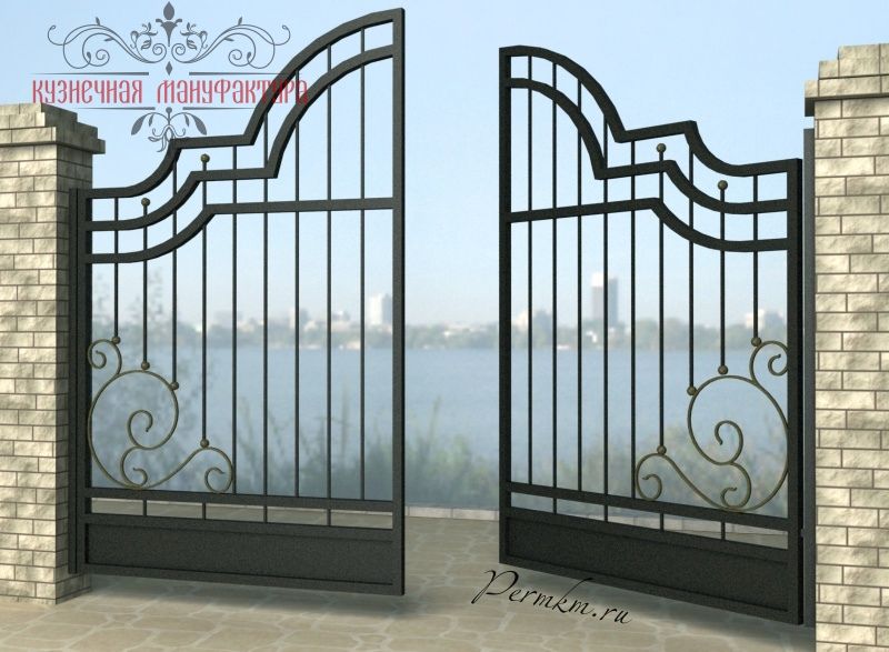 Кованые ворота привносят свою особенную нотку в общий вид участка. Их могут украшать цветы или металлические завитки, острые шпили, затейливые абстрактные или флористические узоры, плавные линии и острые углы, прутья разной толщины и формы. Вид узора кованых заборов, цвет металла и сочетание его с другими строительными материалами позволяет воплотить в реальность любые дизайнерские задумки.