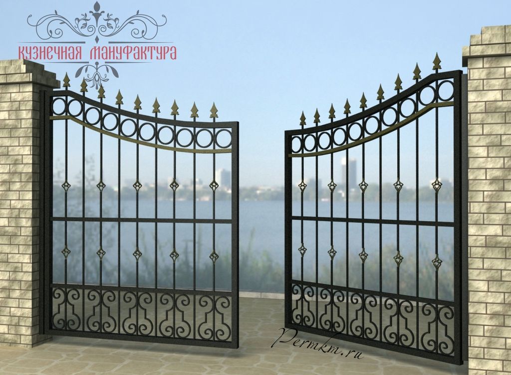 Кованые ворота привносят свою особенную нотку в общий вид участка. Их могут украшать цветы или металлические завитки, острые шпили, затейливые абстрактные или флористические узоры, плавные линии и острые углы, прутья разной толщины и формы. Вид узора кованых заборов, цвет металла и сочетание его с другими строительными материалами позволяет воплотить в реальность любые дизайнерские задумки.